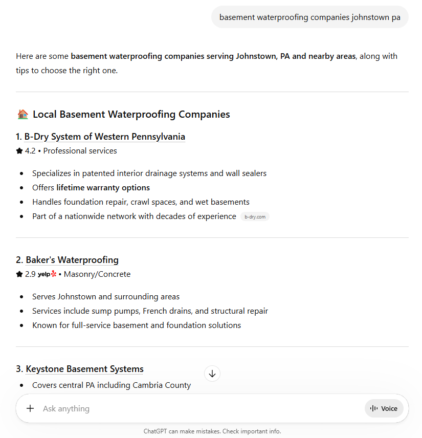 More homeowners are now using ChatGPT, Claude, and Google’s AI Overviews to research contractors before clicking a single website. Generative Engine Optimization (GEO) determines whether your business gets mentioned when someone asks an AI “who are the best basement waterproofing companies in Lancaster PA?”